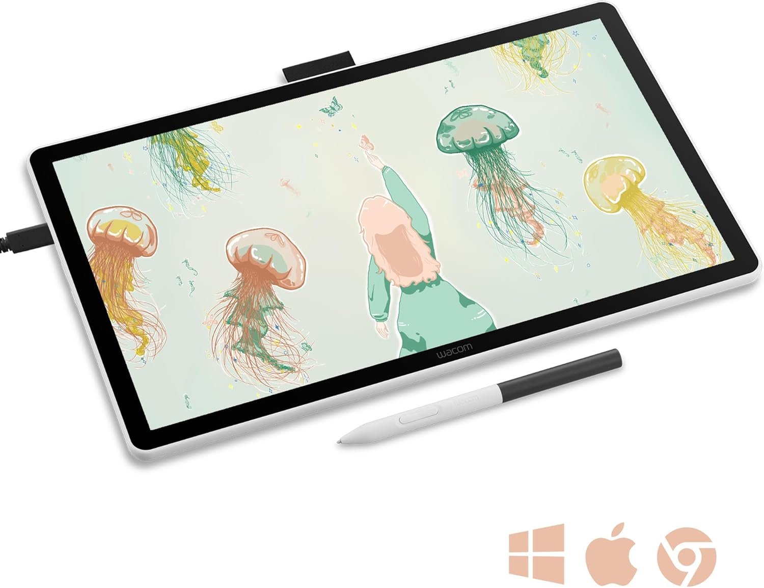 La Wacom One 14 es compatible con Windows, macOS y ChromeOS. Se conecta a través de USB-C con modo DisplayPort Alt, o mediante adaptadores oficiales cuando el dispositivo no lo incluye. Su diseño ligero y moderno permite trabajar cómodamente en cualquier espacio.